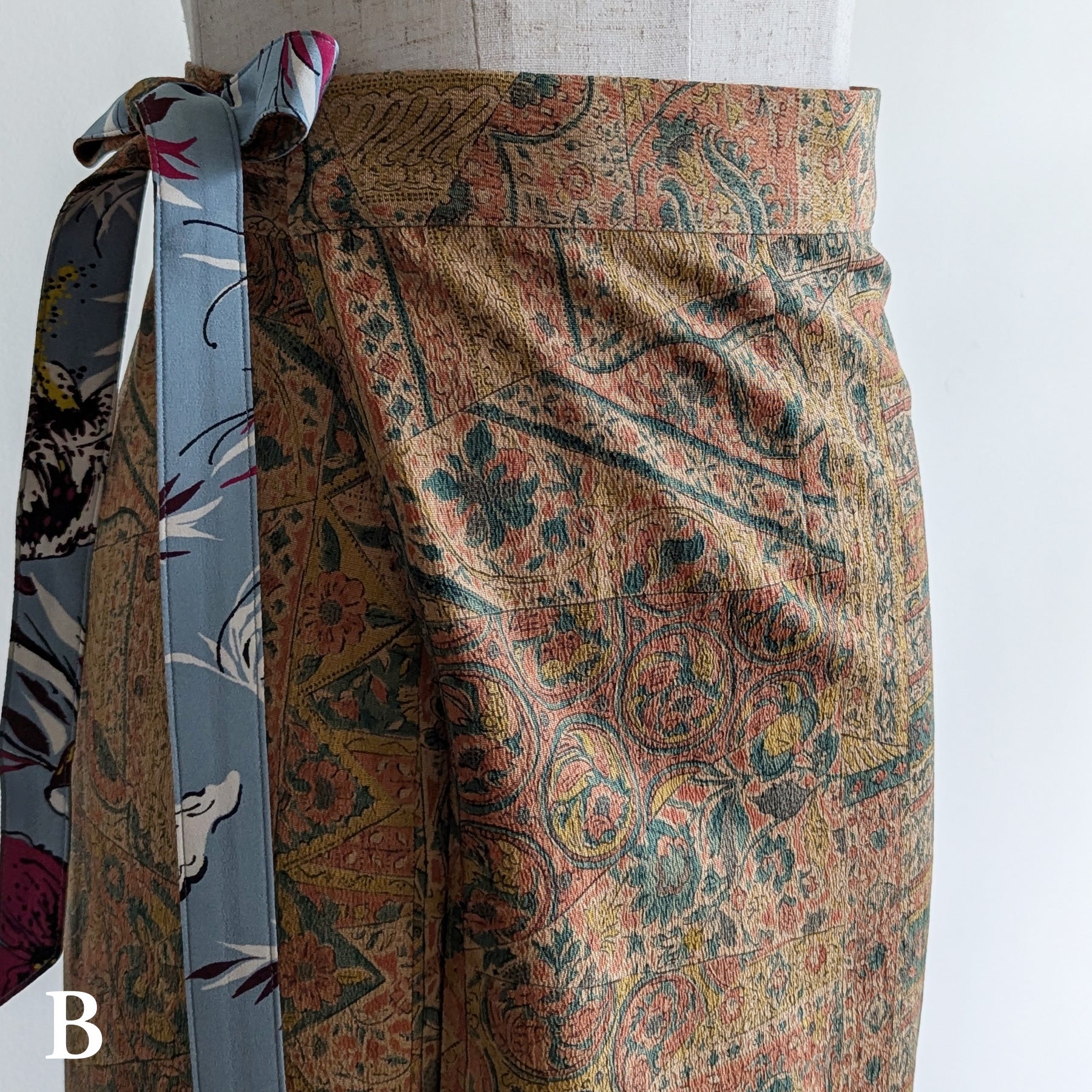 A flare type reversible skirt that combines dead stock kimono fabric and dead stock Italian silk.