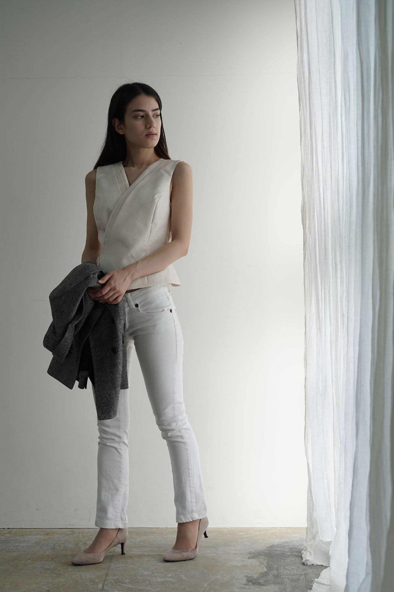 カシュクールタイプのトップスはスカートはもちろん、パンツスタイルにもぴったりです。