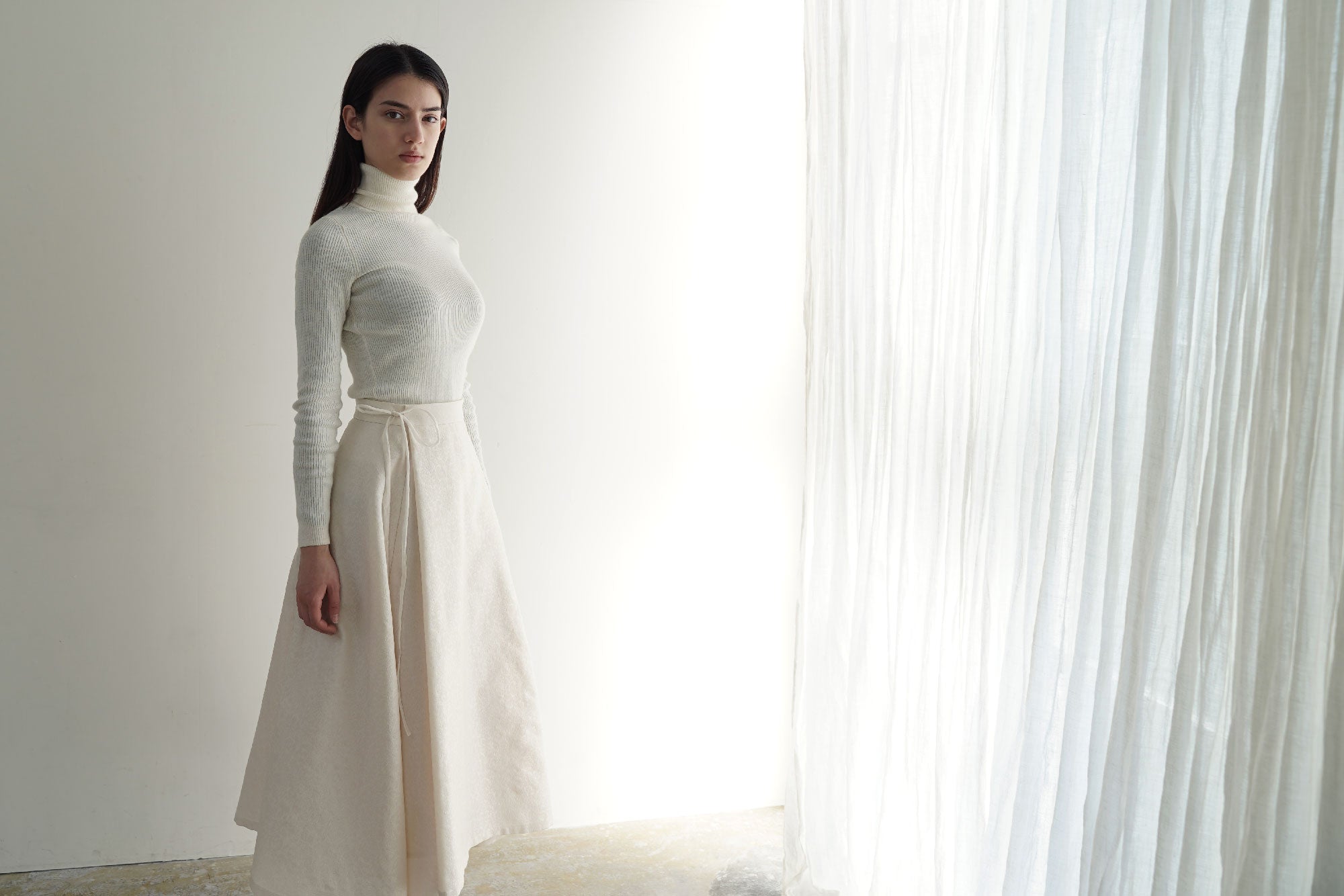 スカート、トップスをそれぞれ別のコーディネートで着ていただくことができます。ボリュームのあるAラインの巻きスカートはブラウス、タートルなどすっきりとしたトップスにあわせるのがおすすめです。