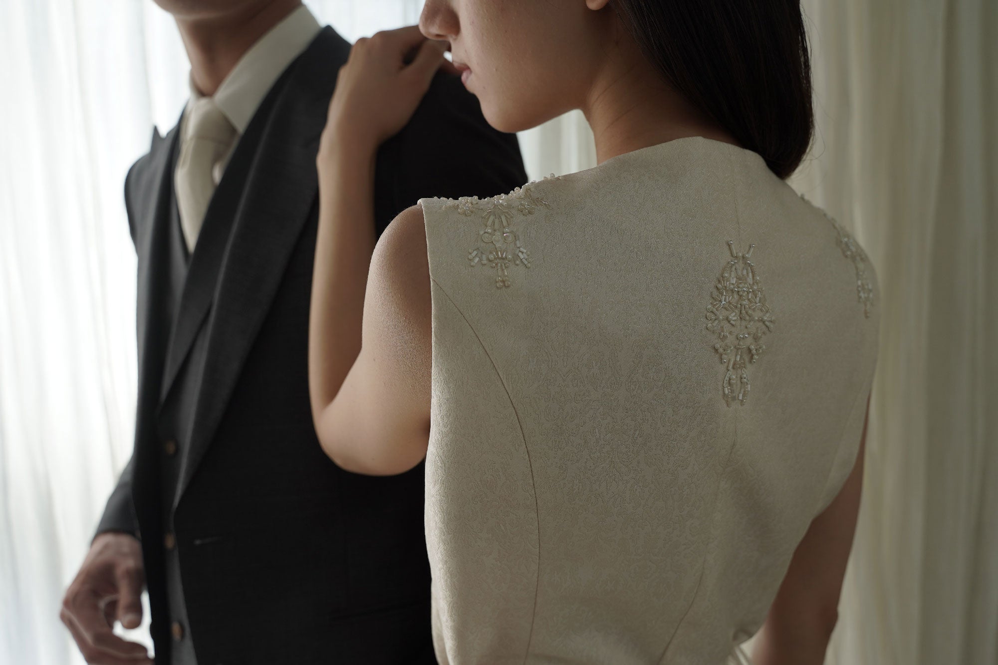 私たちは、ウェディングドレスを挙式の一日のための衣装ではなく、一生を通じて着られるものにしたいと考えました。生涯愛され続けるドレスを作るには、長い歴史と深い価値を纏う特別な素材がふさわしいと感じ、選んだのが日本の伝統と匠の技が息づく「西陣織」です。